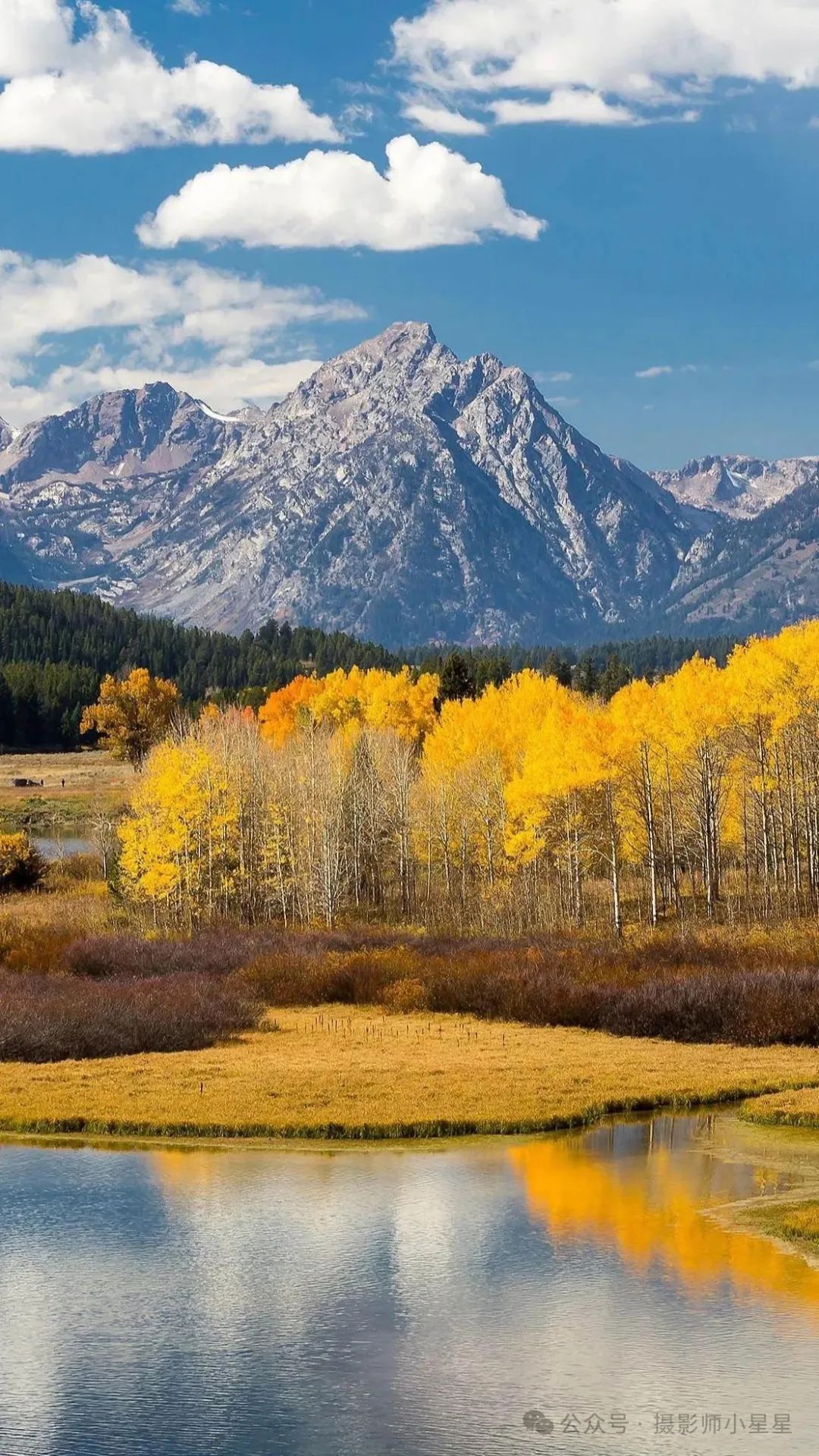 湖水静谧无声,像一面镜子,将蓝天、白云、金黄的树叶以及远处群山的轮廓,一一映照收藏。山脉穿上了秋的华服,林间叶片色彩斑斓,从深绿转为金黄,又从金黄递变为火红,这渐变的律动,被湖水以近乎虔诚的态度复制着,一草一木都淋漓尽致,栩栩如生。