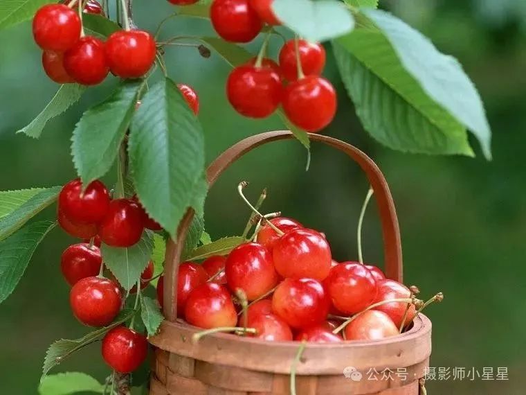 一串串晶莹剔透的樱桃,如同宝石般闪烁着红色的光芒。它们紧密相连,彼此依偎,像是在诉说着秋天的丰收故事。细看之下,每颗樱桃都像是被露水亲吻过,带着清新的生机。