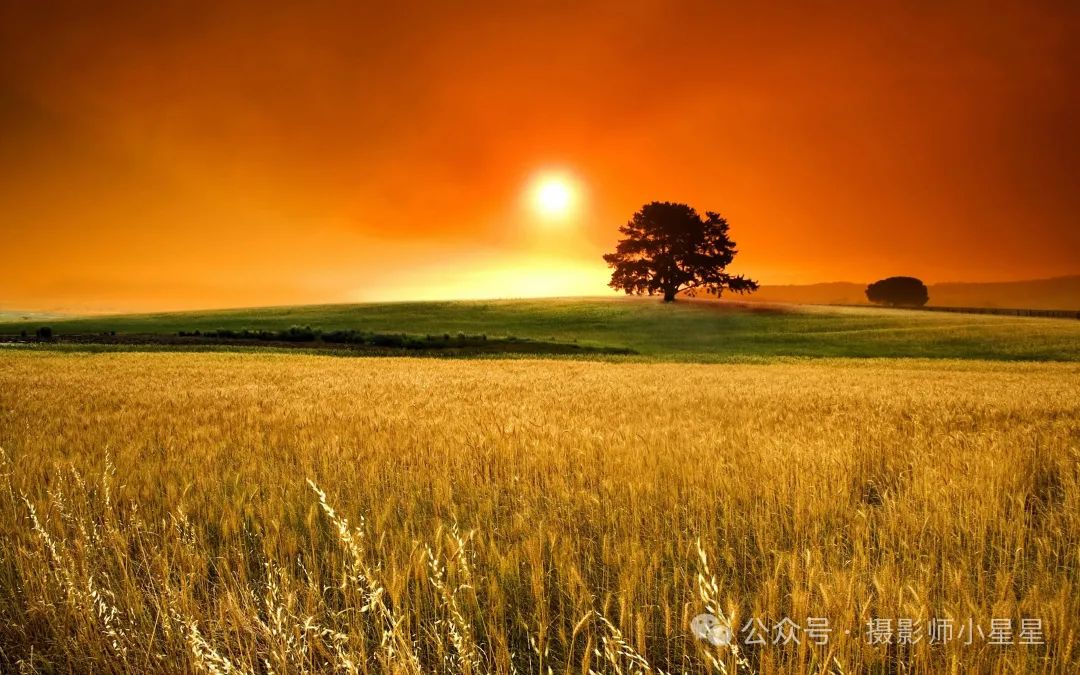 秋天的傍晚,落日余晖映照在湖面或田野上,美不胜收。