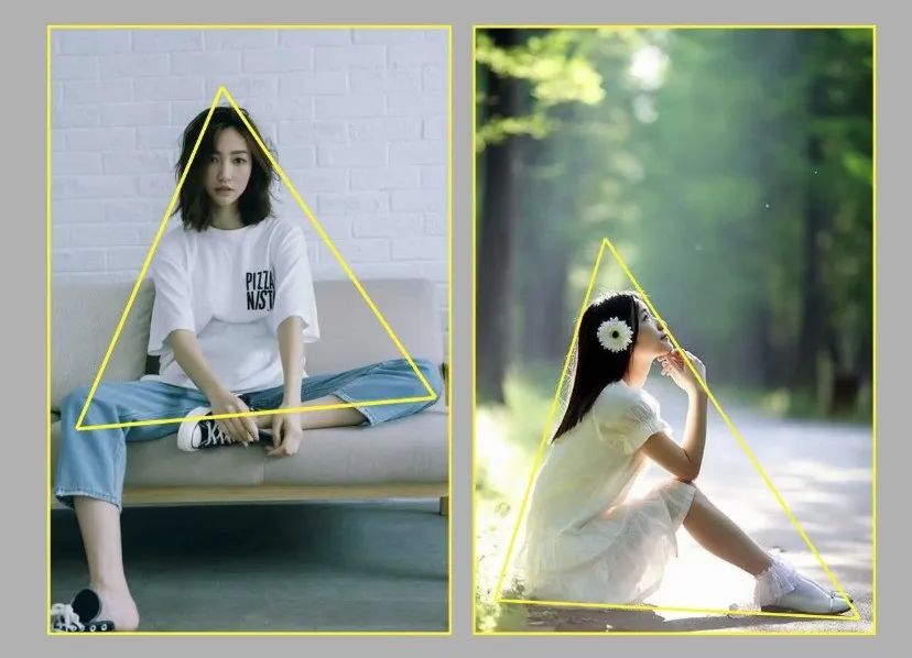 分为正三、倒三角、斜三角,拍摄时利用人物主体的肢体动作来组合成三角形。