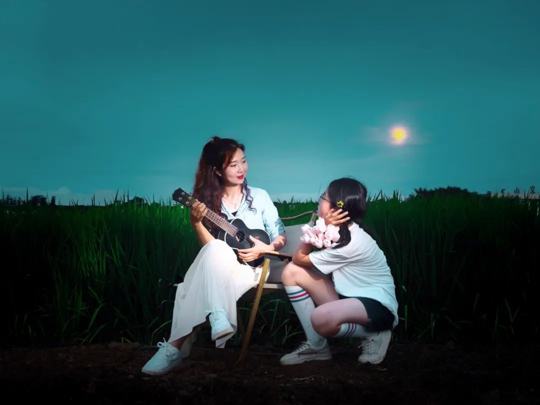 拍摄说明:月光下,稻田边,母女弹着琴,聊着天,听风吹稻田,虫鸣蛙叫。