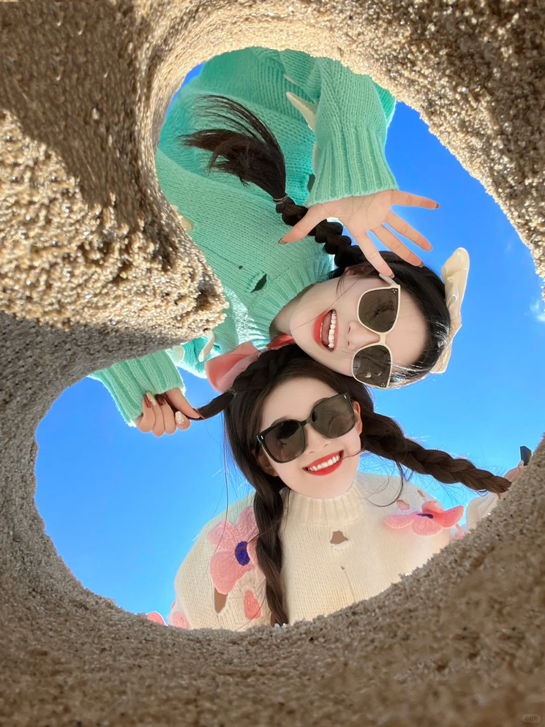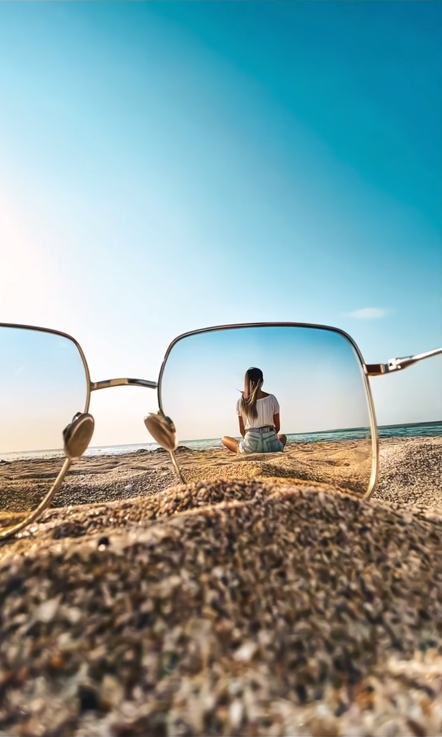 走远一点坐下来,眼神看远方,摄影师在人物的后面地上放一个眼镜,利用镜框做框架构图框住人物,倒转手机贴近地面,透过镜片去拍摄,这样拍出来的照片不仅有趣,画面还干净简洁,高级感满满。