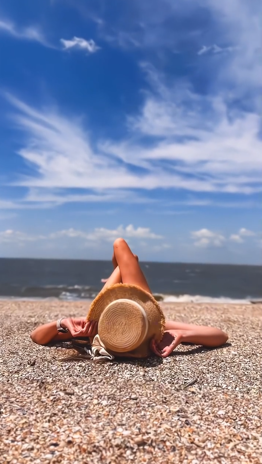 戴一个帽子,在干净的沙滩或草地上躺下来,屈膝,一条腿自然的搭在另一条腿上,如果手不知道放哪里的话可以摸帽子。这样的画面,自然、松弛感满满,简单易学还高级。