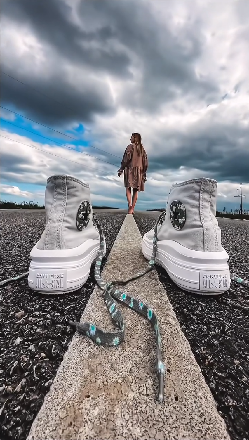 找一个安全些的道路,脱下鞋子放镜头前面,人物背对镜头向前走看旁边,摄影师倒转手机,使用0.5倍广角镜头拍摄,手机贴近地面,马路上的白线做引导线,利用近大远小的空间透视关系拍出极具视觉冲击的创意照片。