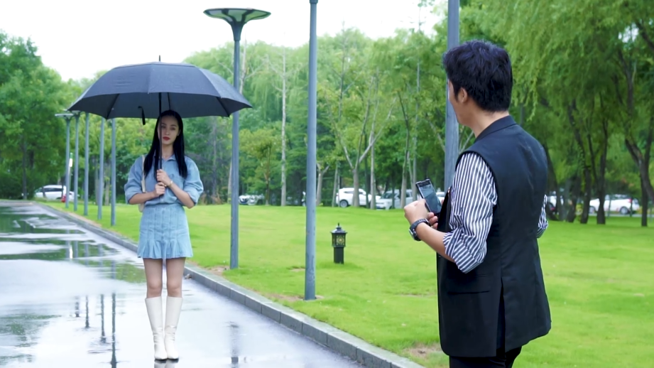 慢慢往前走,然后停一下,做一个跨步的动作,这样我们就拍了一些在雨中漫步的孤独美女的图片。