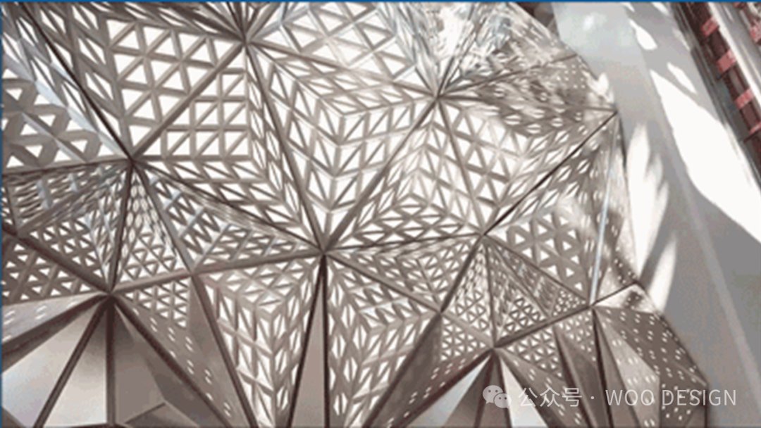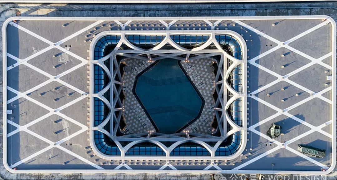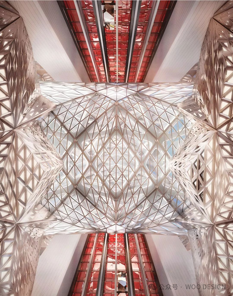夜空之眼中庭外幕墙则采用超白玻璃,最大程度上将中庭的光线透射出来