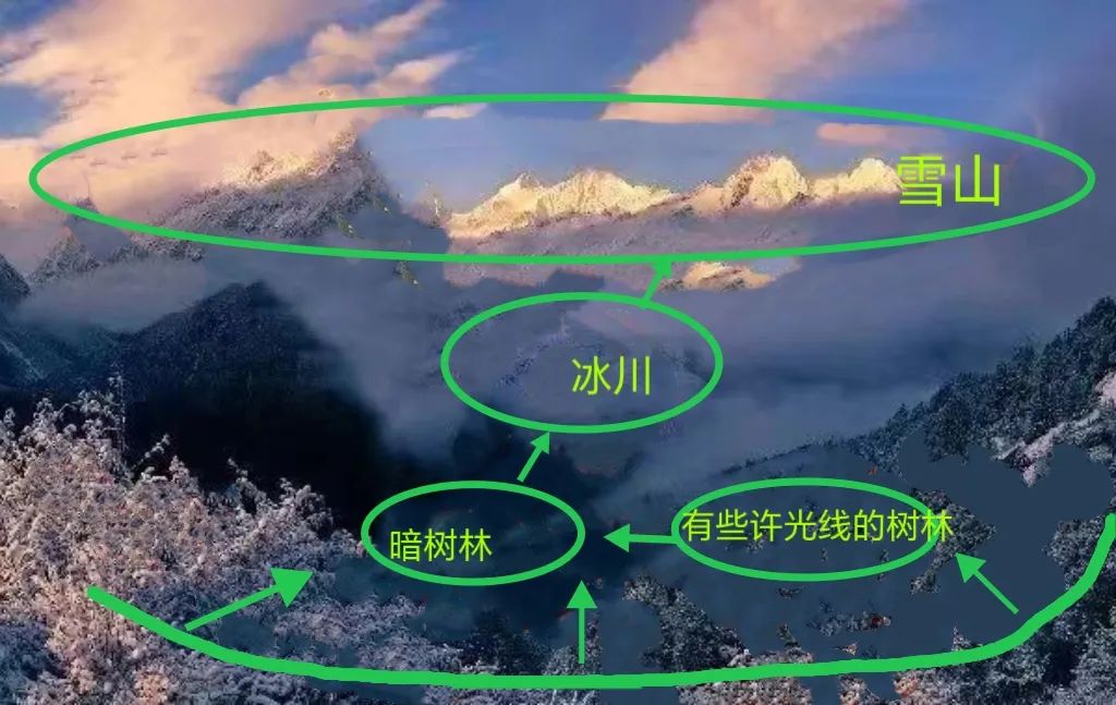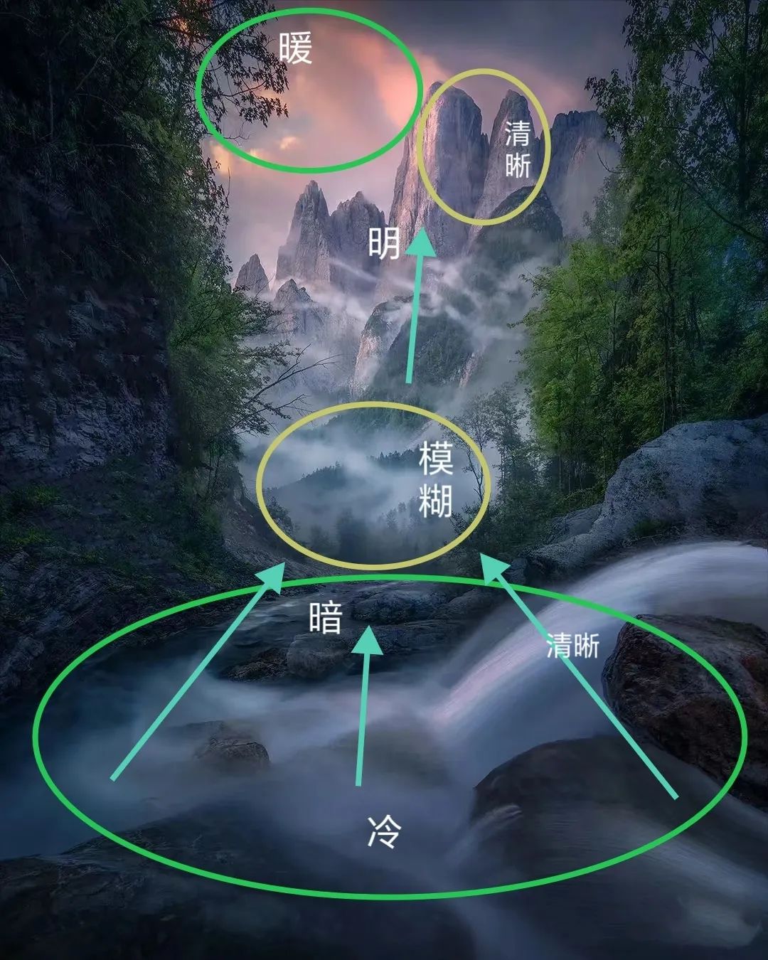 如下图,如果没有云雾,则远景处的山峰则非常难被分隔开,我们可能会感觉都在同一个平面上。而在前景处,也存在着从明到暗的过渡,使观众的视线自然地从前景处“流”向画面纵深。