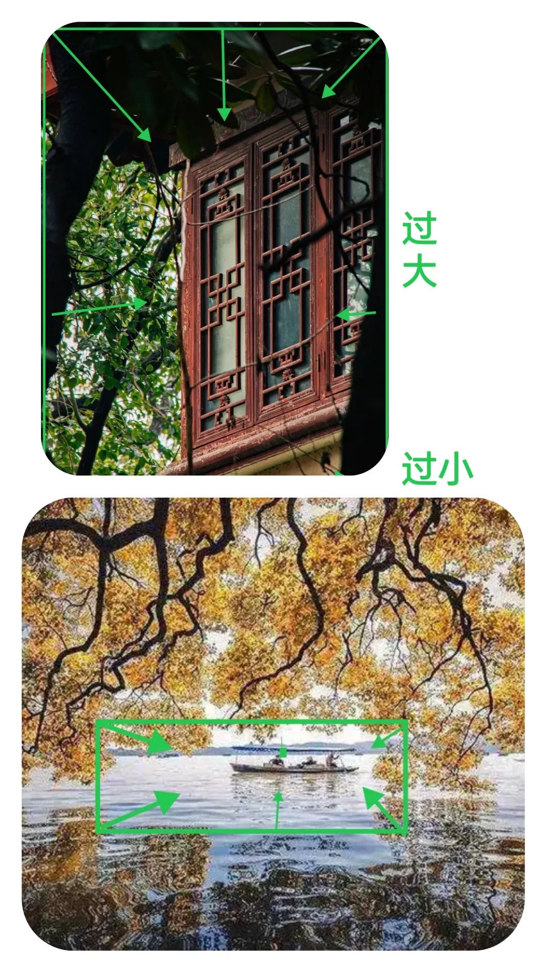 若框架比例过小,其遮挡与集中视线的功能将难以凸显;而若框架比例过大,则可能破坏画面的整体和谐美感,影响视觉效果。如图