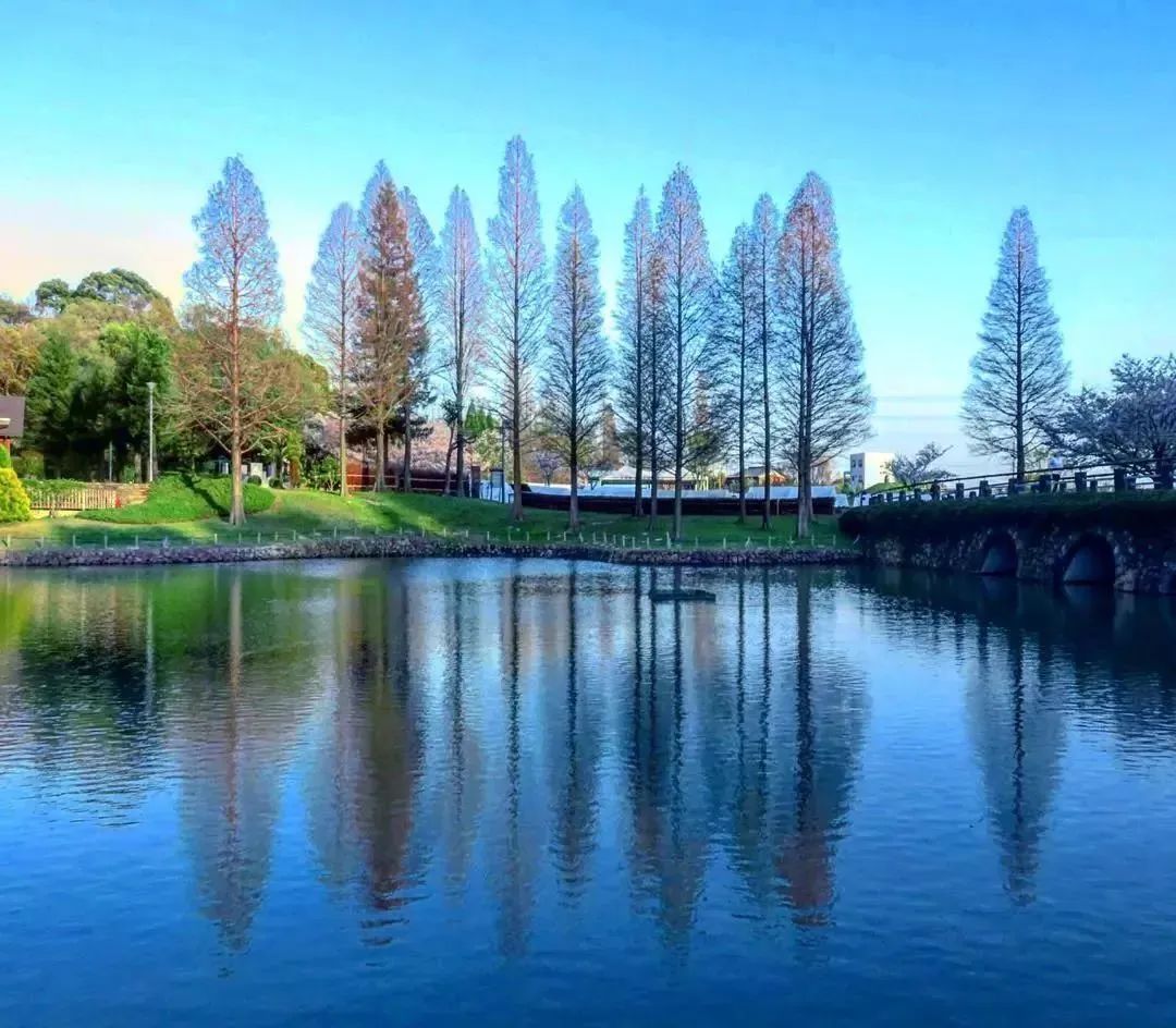 还有河岸两边种植的树木,隔岸拍倒影,把水平线端平,上下对半,也能让画面极度舒适。