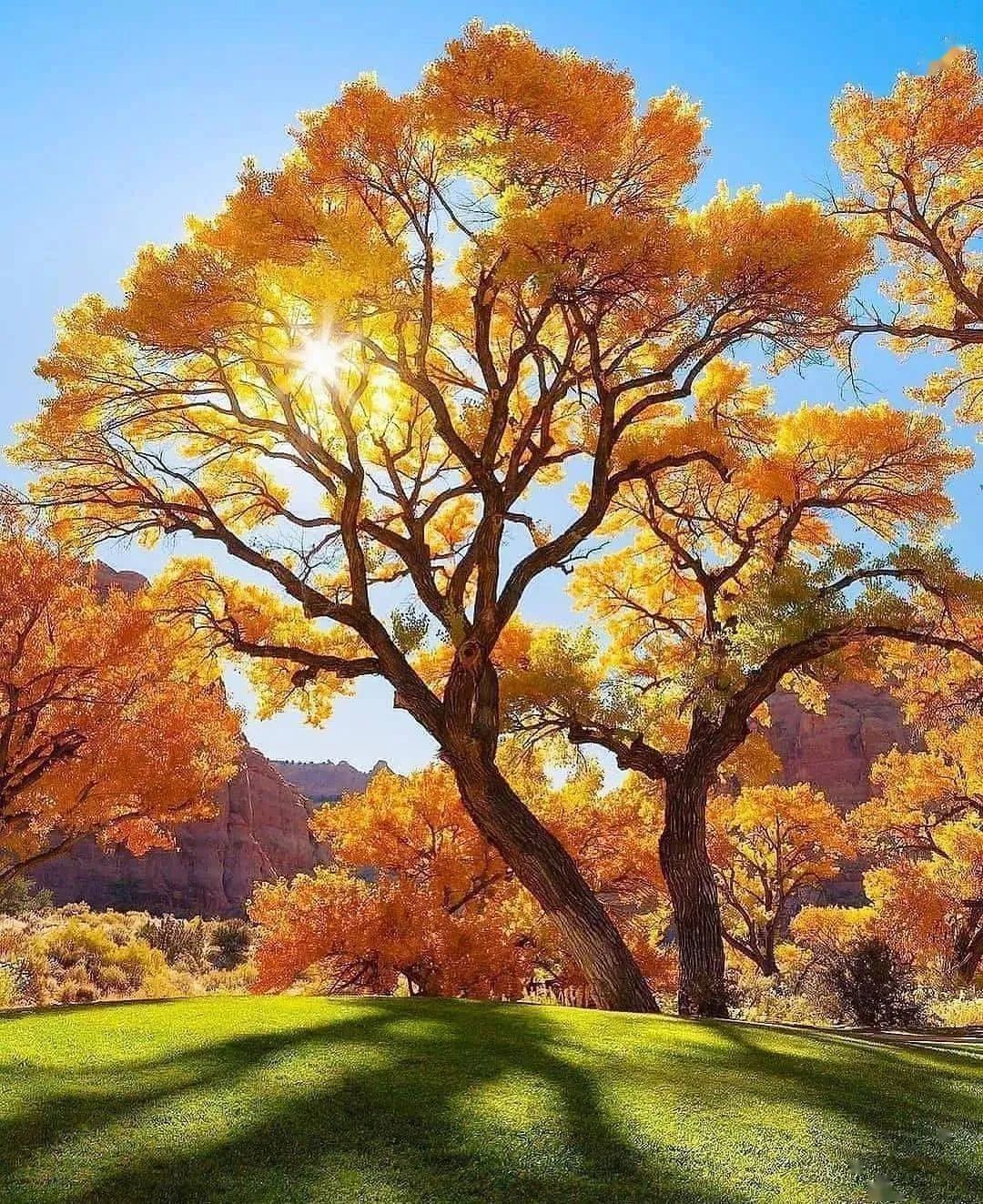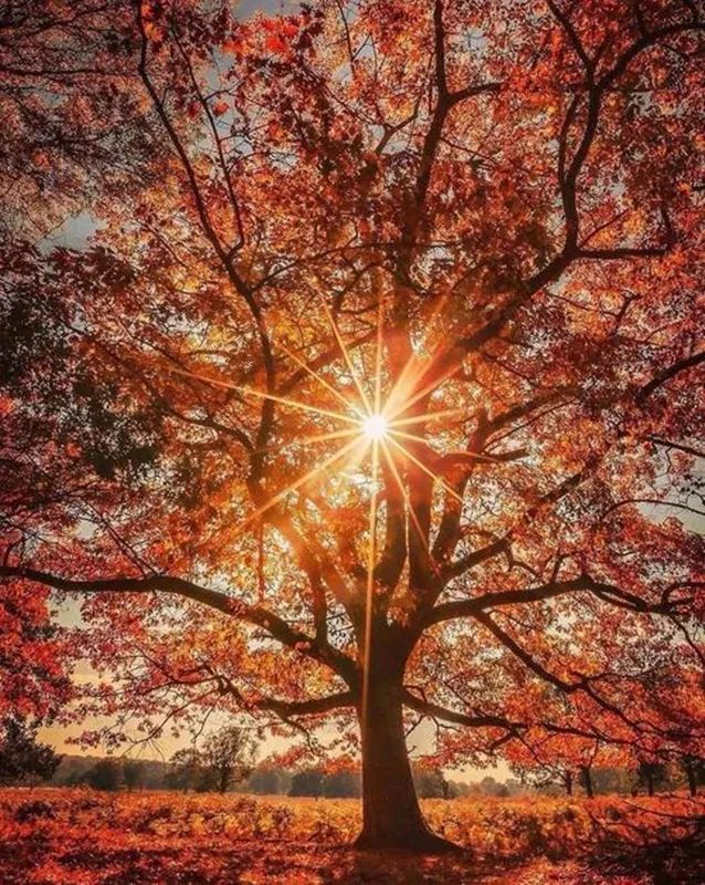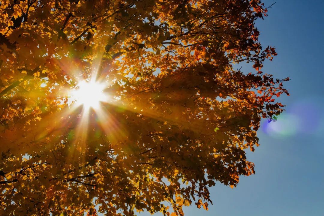 在傍晚太阳快落山的时间段,太阳距离地面的位置不高,光线也很柔和。太阳“挂”在树枝上的时刻,就可以利用小光圈,拍摄出星芒效果。