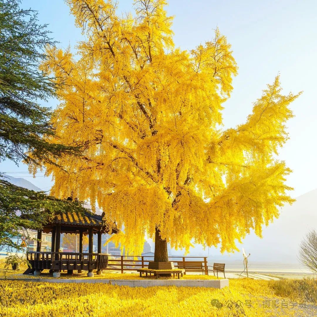 一棵巨大的黄色树下,搭配传统的凉亭,是拍摄秋天细节美的绝佳场景。将手机举高,从上往下拍摄,让凉亭和长椅成为前景,树木和远处的山脉作为背景。通过调整手机的焦距和构图,突出凉亭的古朴与树叶的金黄,营造出宁静和谐的氛围。