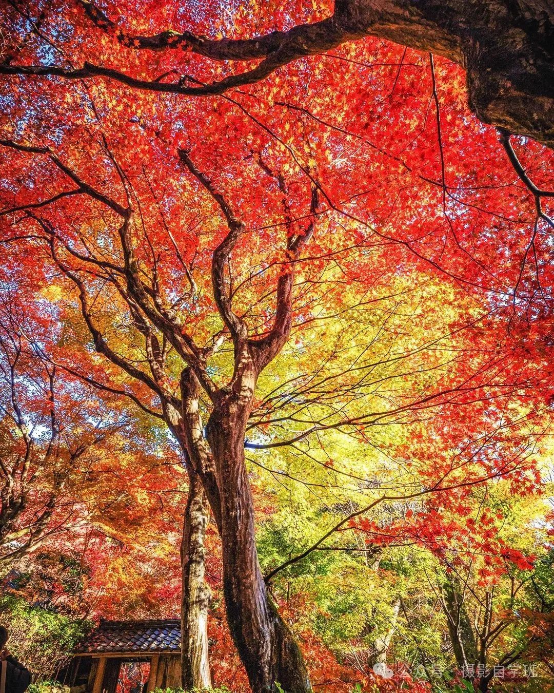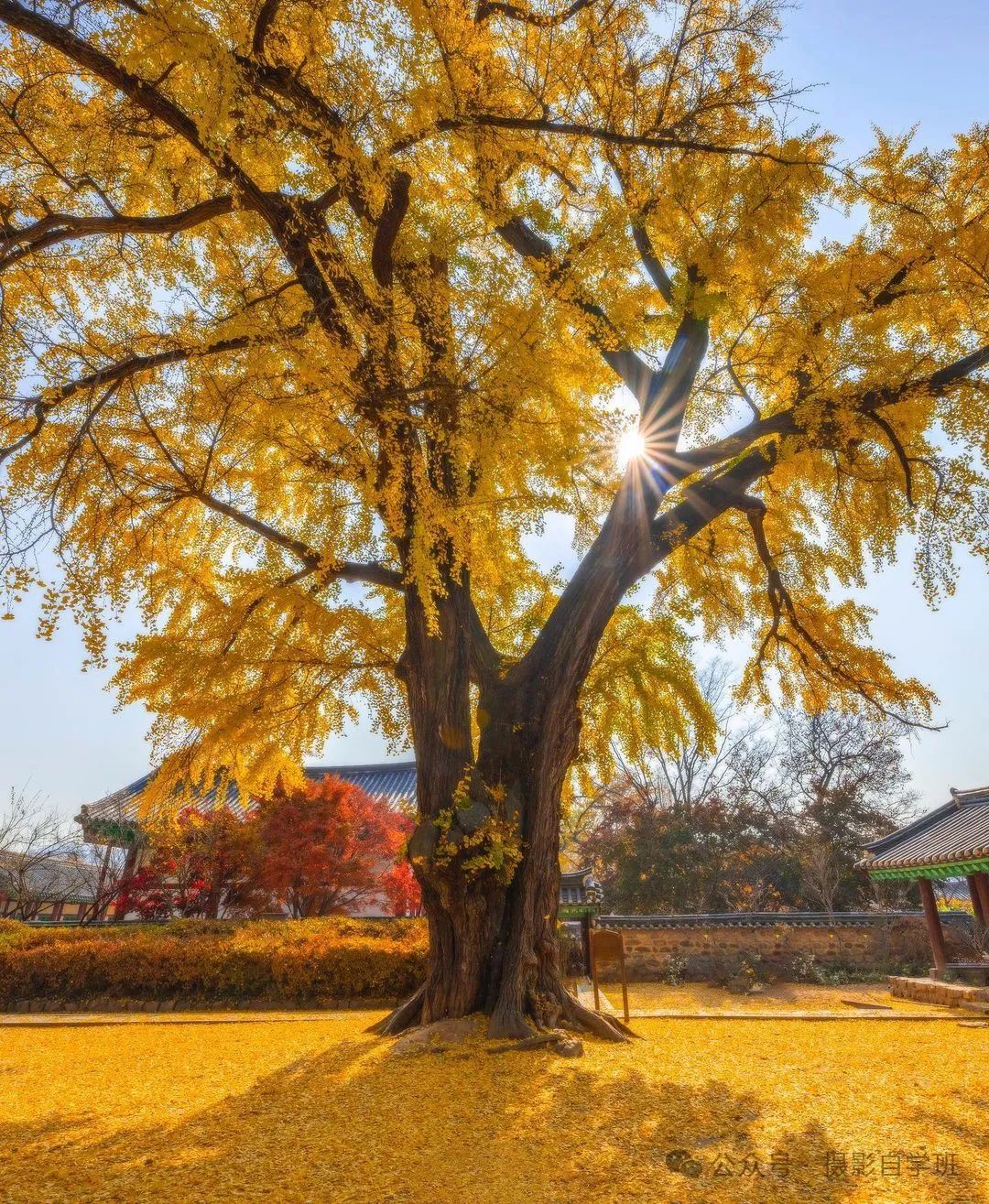 寻找一棵颜色鲜明、形态独特的树木作为主体,如照片中的金黄大树。利用手机相机的微距功能,细致捕捉树叶上的光斑与纹理,展现阳光的穿透力与树叶的质感。同时,将周围的红绿树木及传统建筑作为陪衬,讲述一个关于季节变换与人文融合的故事。适当降低曝光补偿,让金色更加饱满,落叶的铺设则为画面增添一份静谧与岁月的痕迹。