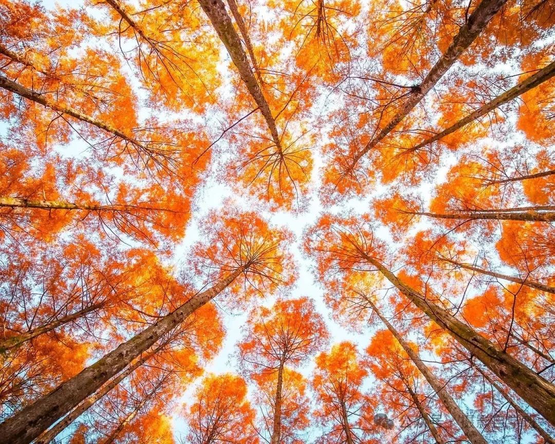 站在低处仰拍树林,可以拍摄到秋天整体的美景。将手机设置为广角模式,捕捉树木的层次感与色彩的渐变。注意调整手机的拍摄角度,让天空成为画面的重要组成部分,通过蓝天与金黄树叶的对比,增强画面的视觉冲击力。