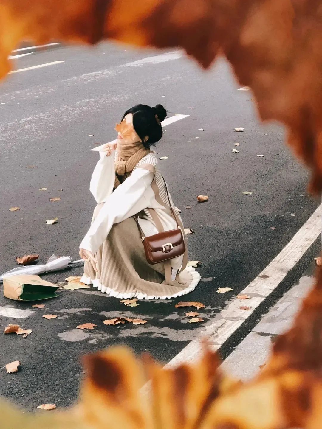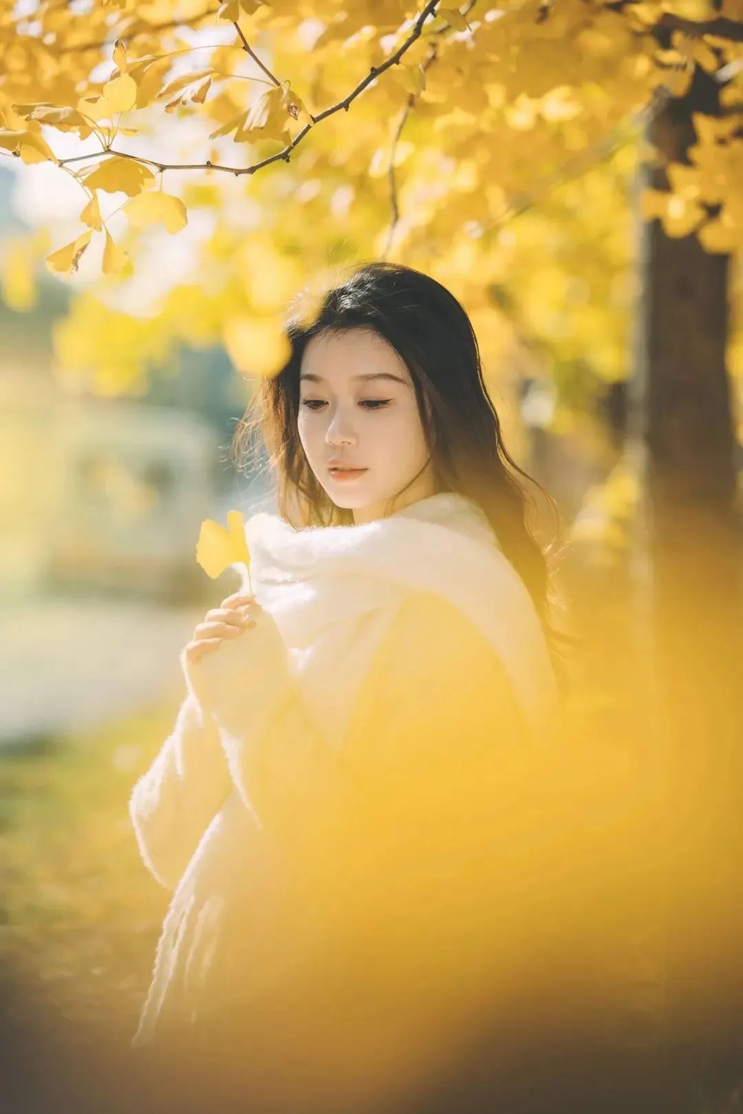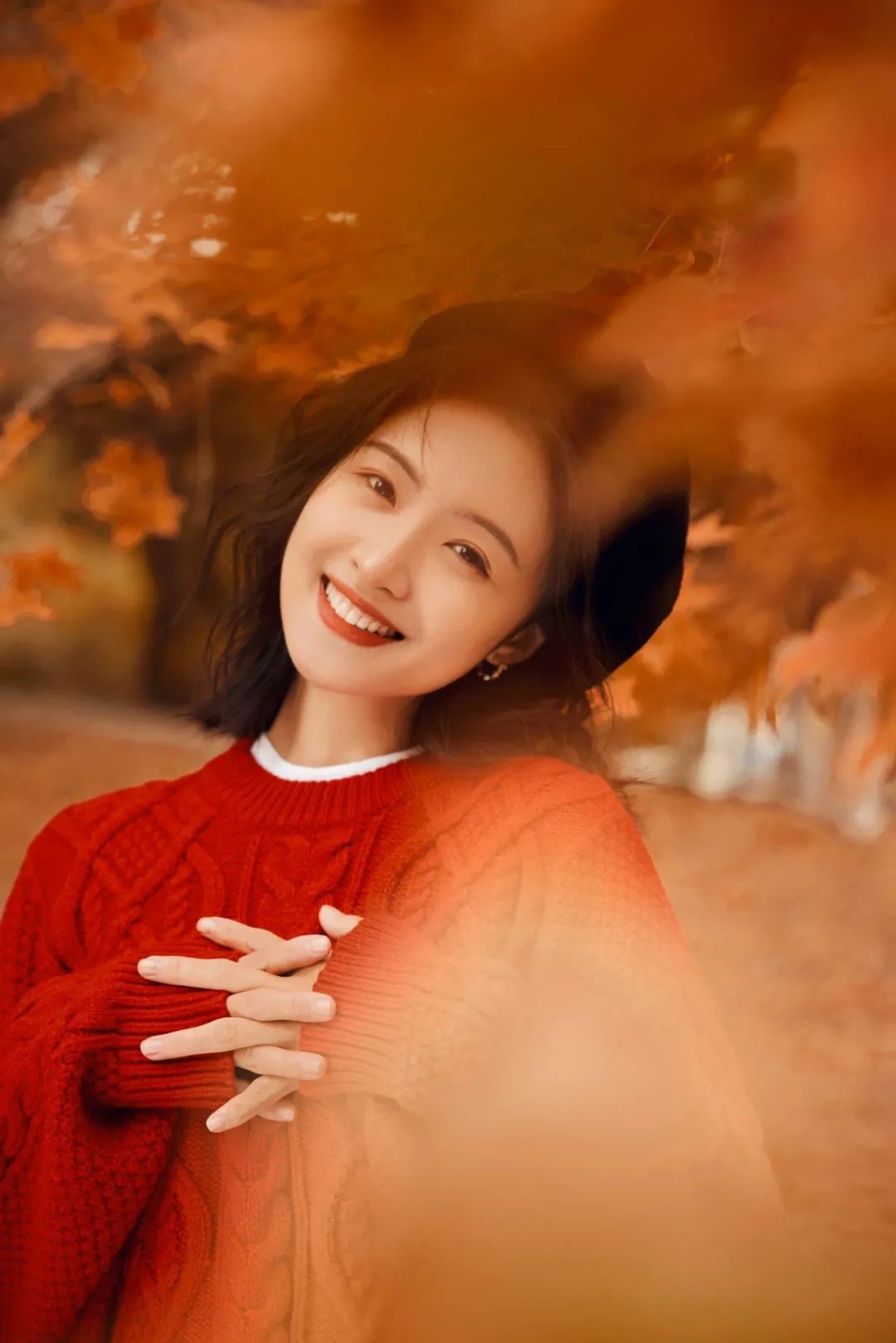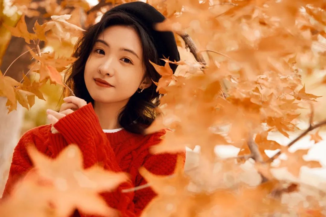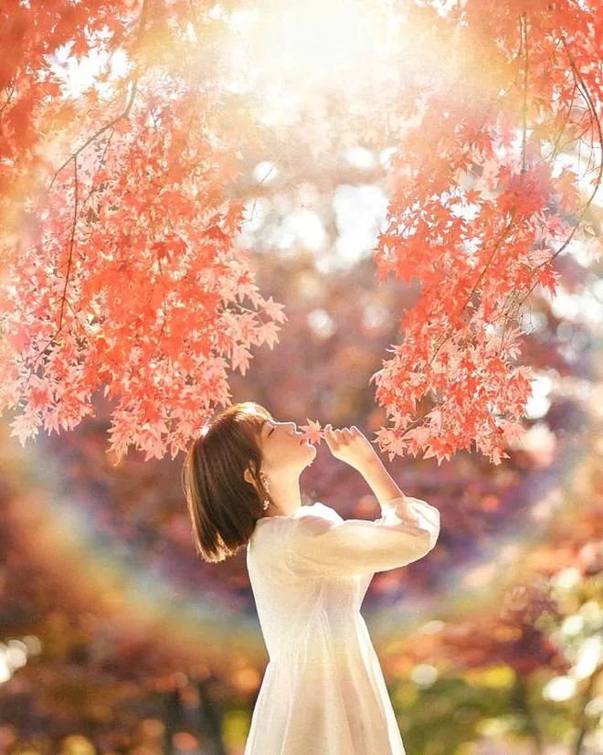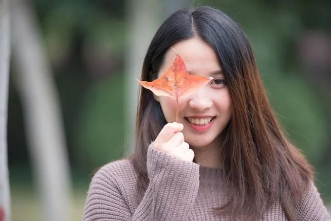 三、落叶飘洒拍侧脸,手拿叶子挡眼睛。秋天拍人像,最“顺手”的拍照姿势,全是和叶子有关的——
