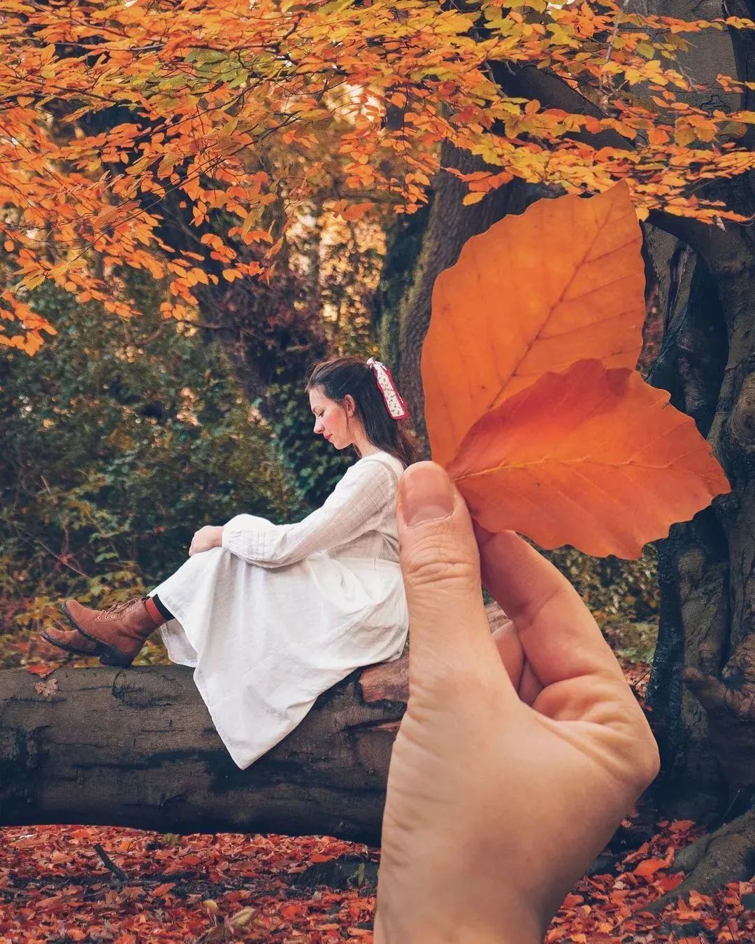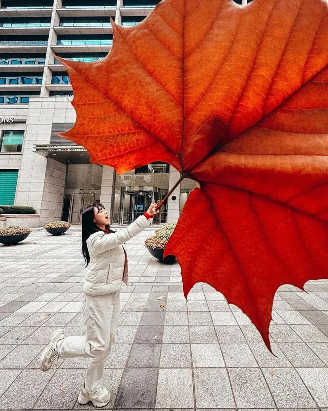 要么用叶子的色彩当前景,要么当背景;或者是拍照姿势和叶子有关系;还有,我们也可以开拓拍照思路,利用叶子和人物之间的远近距离,拍摄出各种有趣的创意摄影。