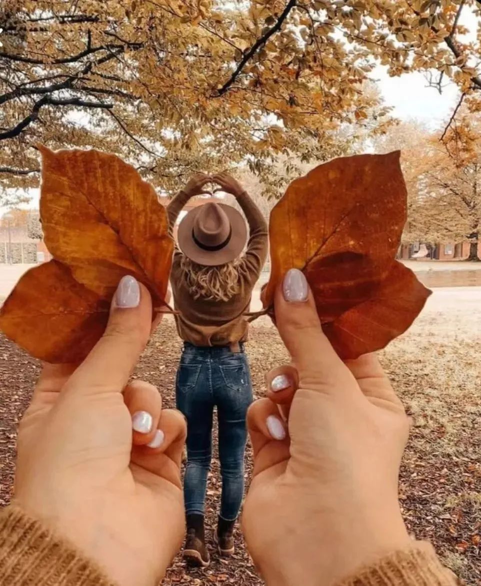 我们可以从落叶中捡一些好看的,在面对镜头的时候,挡住眼睛。