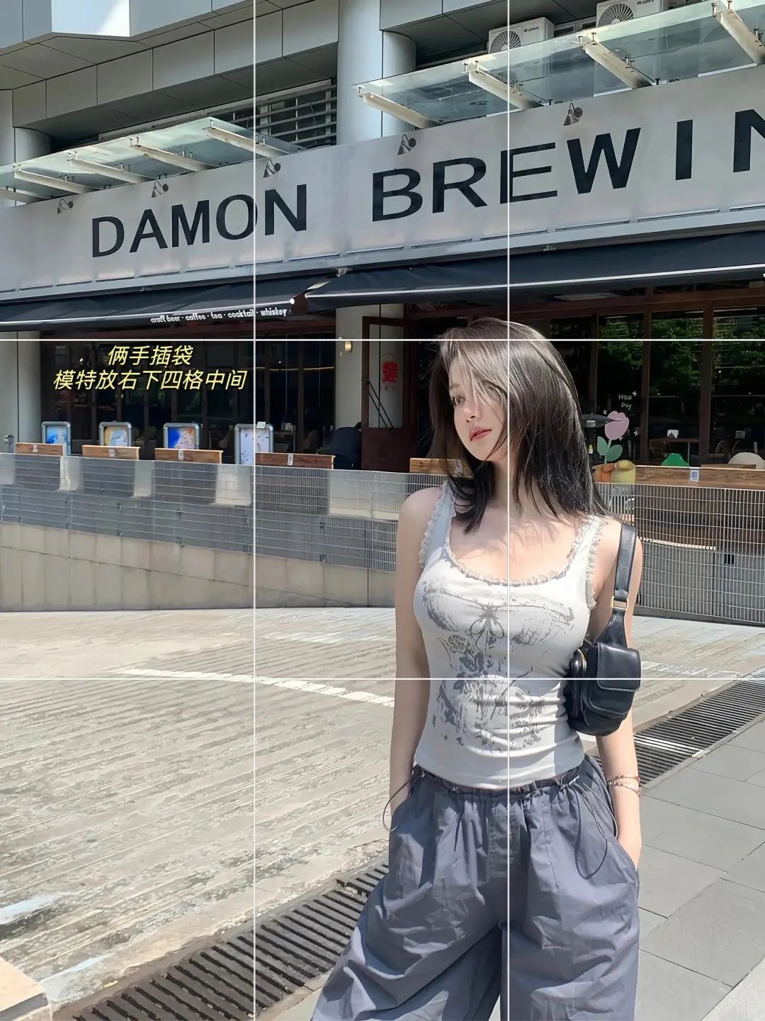 拍摄时,将人物放在画面的右下方,同时双手插兜,给人一种随性自如的感觉。轻微歪头不看镜头的动作,让照片看起来更加自然随意,仿佛是在不经意间被拍下。这个构图非常适合在街拍或旅行时使用,轻松拍出个性照片。