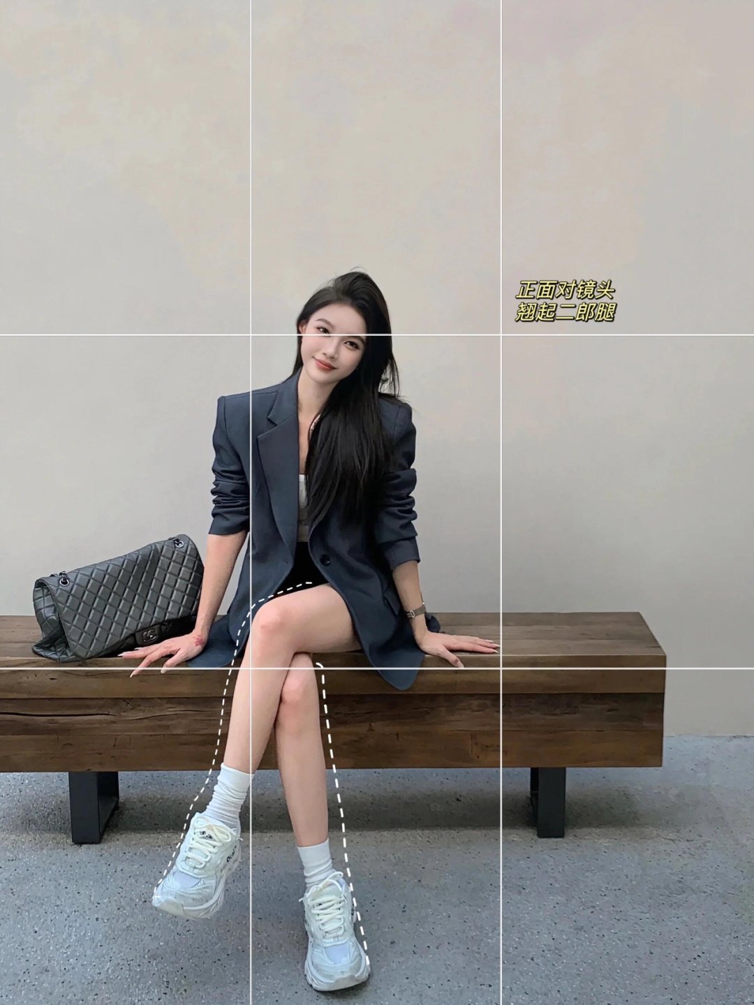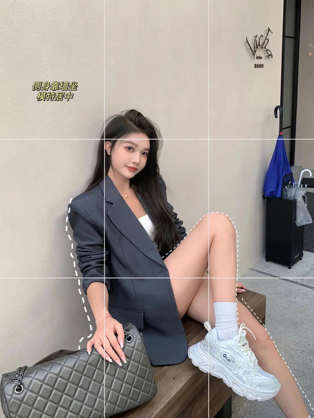 拍照时靠墙坐下,身体侧向镜头,这样的姿势既能拉长身体线条,又能增加照片的层次感。将人物居中放置,同时轻轻翘起一只脚,眼神看向镜头,能够让照片显得更有空间感且充满立体感,构图简洁而富有视觉冲击力。