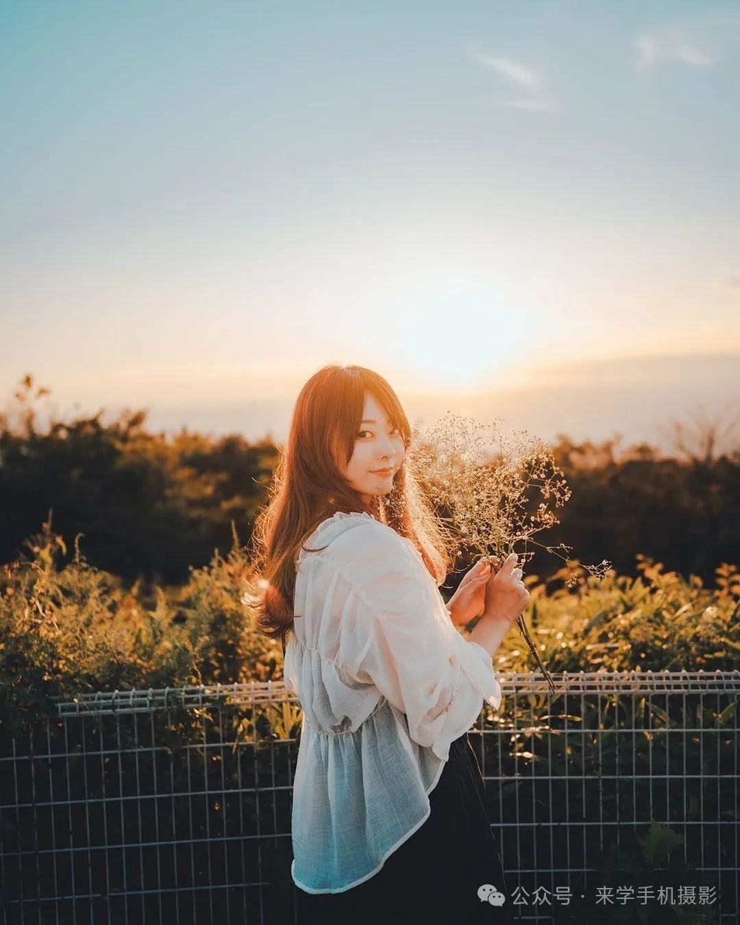 现在很多手机逆光拍摄之后,会自动调色,人的脸不会太暗,所以即使逆光拍摄也不需要补光灯和反光板了,手中可以拿着一束花,把花举到鼻子前,你回头看镜头,逆光的光线会让你的头发更有质感,你回头的姿势拍出来也会更加自然。