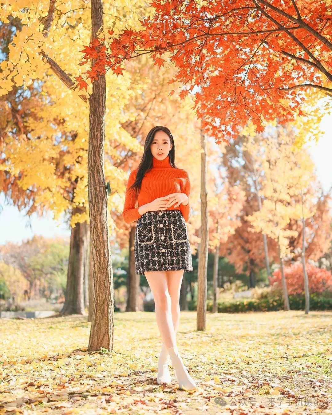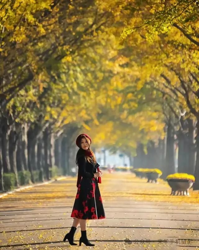 还可以寻找一些小路,秋天树叶已经变成黄色,让被拍摄的人穿着红色的衣服,与现场的环境做出区别,你离远一点,拍出人的全貌,让被拍摄的人侧身站立两条腿,一前一后两只手放到胸前的围巾上,回头看镜头,你还要顺着路向前拍出纵深感,但所有拍摄都是以绝对安全为前提。