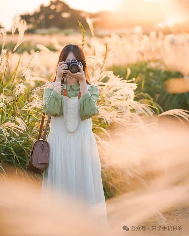 还可以找一些芦苇,在午后拍摄,接近傍晚的时间,光线更加柔和。用芦苇花遮挡镜头,形成前景虚化,你从手机的屏幕上点击屏幕上的人,引导模特可以准备一些道具,比如她也可以拿着一个相机,对着你的镜头拍。