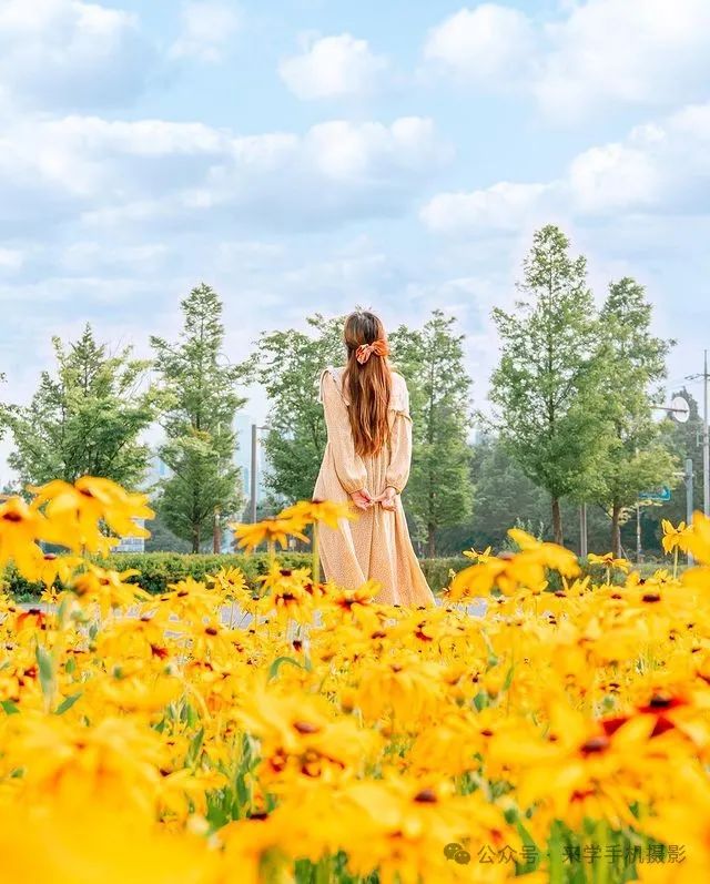 还可以在一些路边的花坛前拍照,你站在远处背对镜头,摄影师拿着手机蹲下来,前景的花朵就会遮挡镜头形成虚化,同时增加了照片的层次,从手机的屏幕上点击被拍摄者的头,照片的层次感和虚实对比就有了。