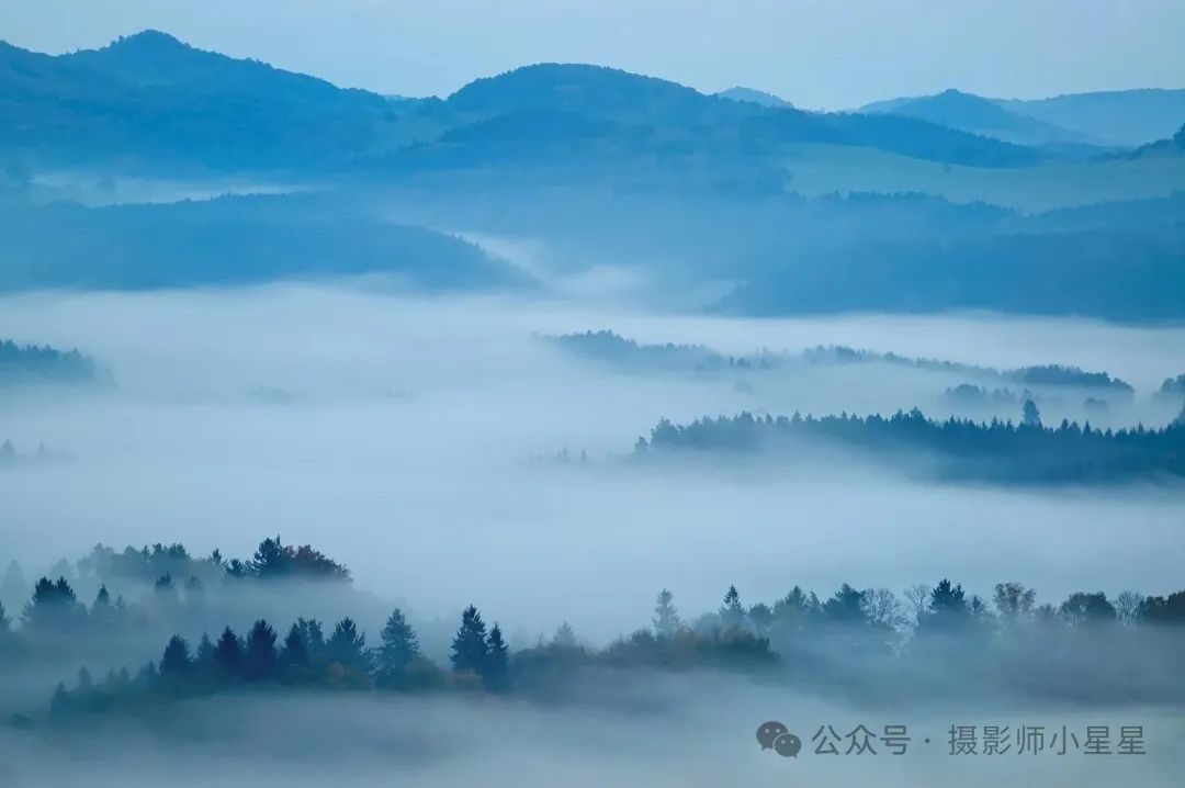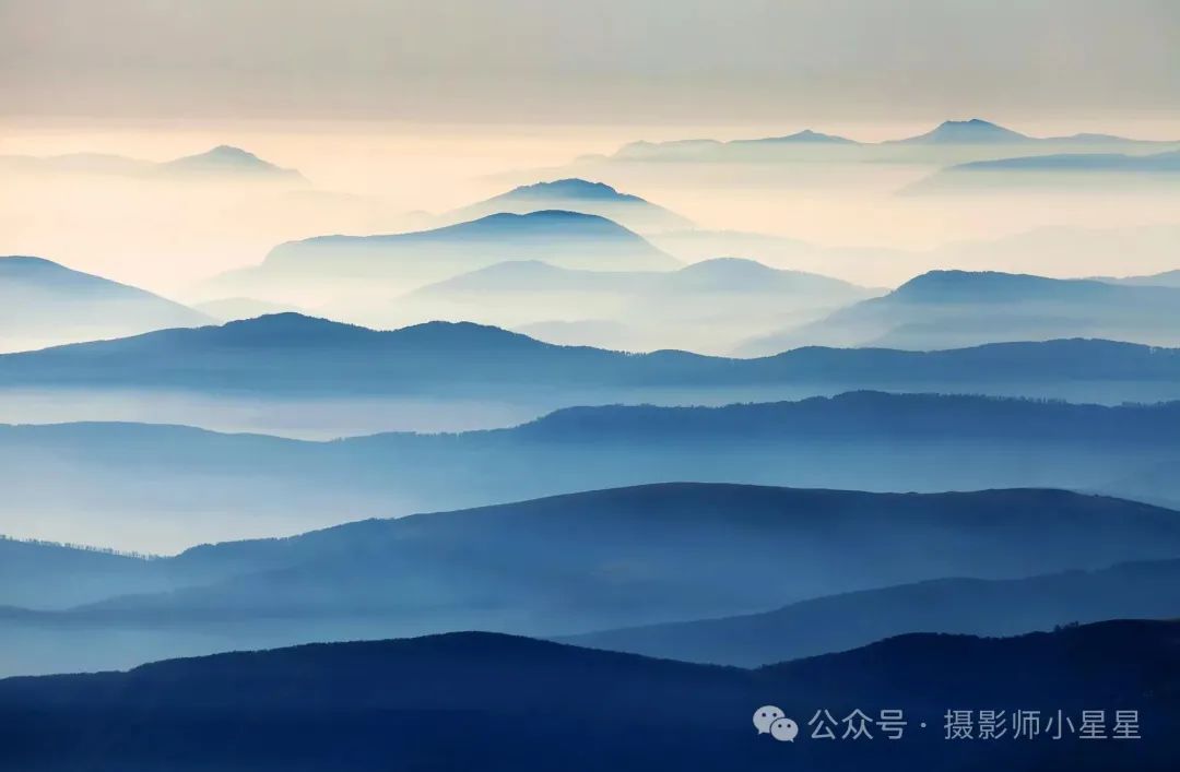 当晨光初现,长焦镜头捕捉到了第一缕曙光,那光芒穿透薄雾,洒在山林之中,金色与蓝色交织出一幅温暖的画面。