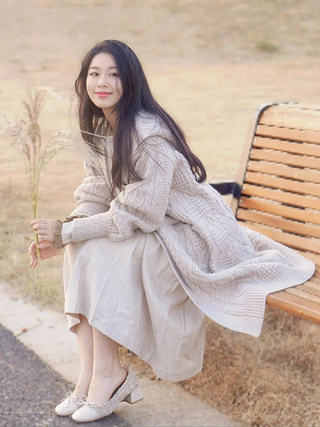 如果你不想站着拍照,不妨找一个地方侧坐下来。可以像这样自然地坐下,双手放在膝盖上,目光看向远处。这样不仅避免了直视镜头的尴尬,还能让你看起来更放松,拍出的照片自然又有韵味。