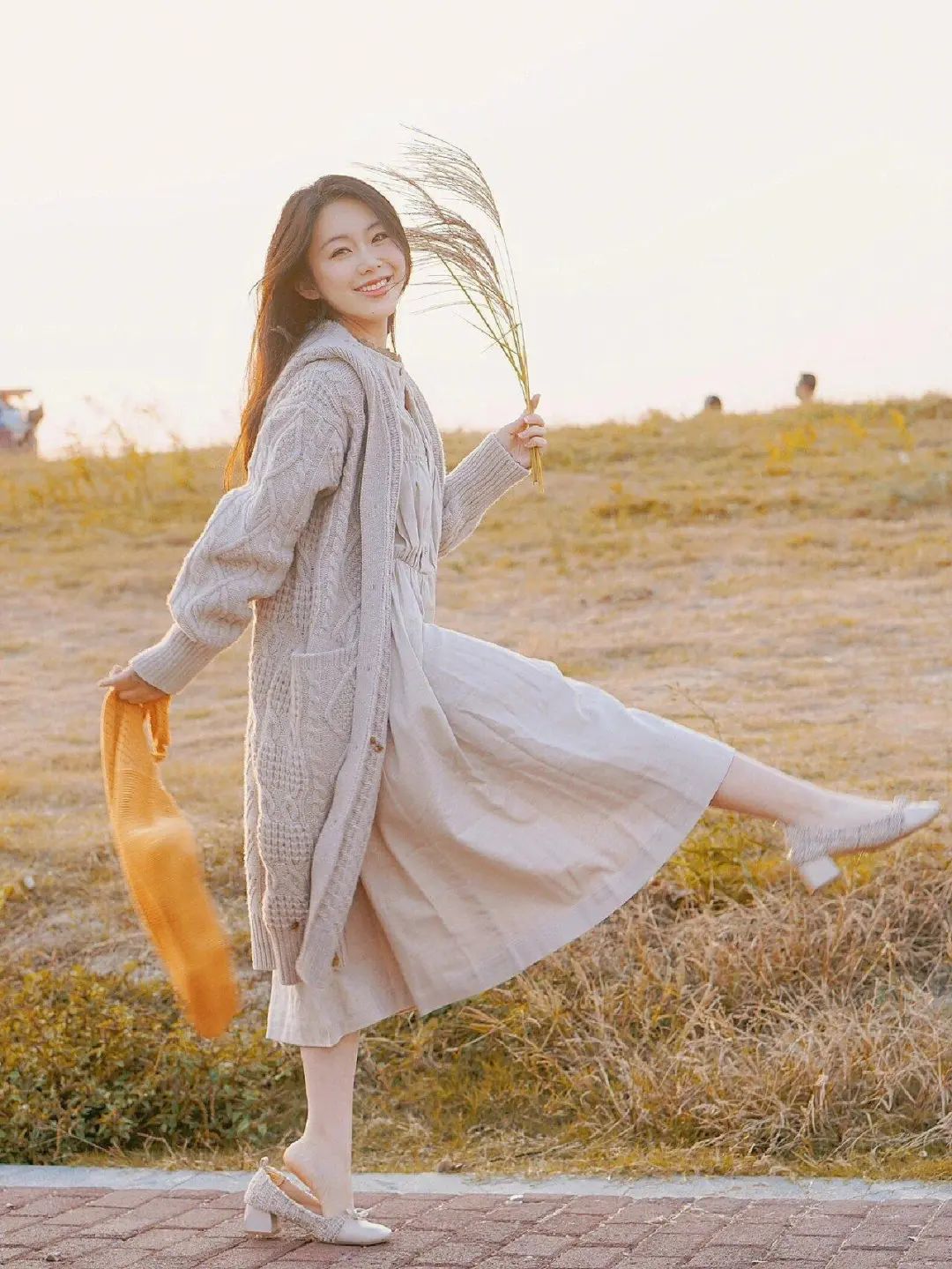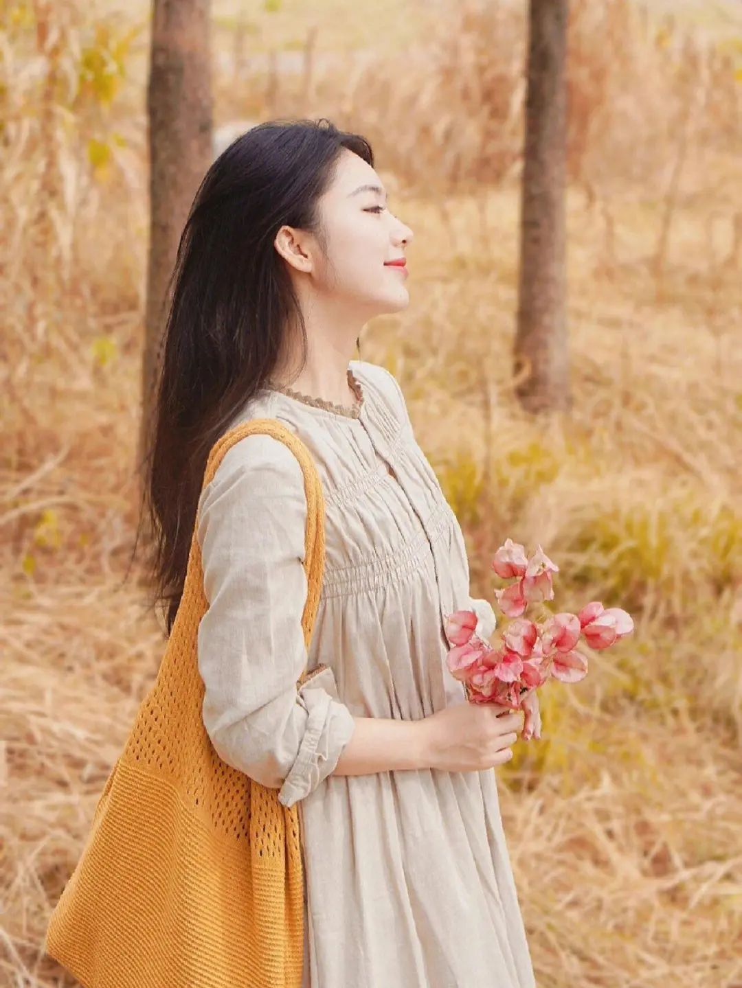 简单的侧身站立,手里拿着一枝花,微笑看向远方。这种拍照姿势非常自然,适合在各种场景中使用,不仅能避免面对镜头时的不自然,还能轻松拍出有意境的照片,整个人显得优雅而从容。