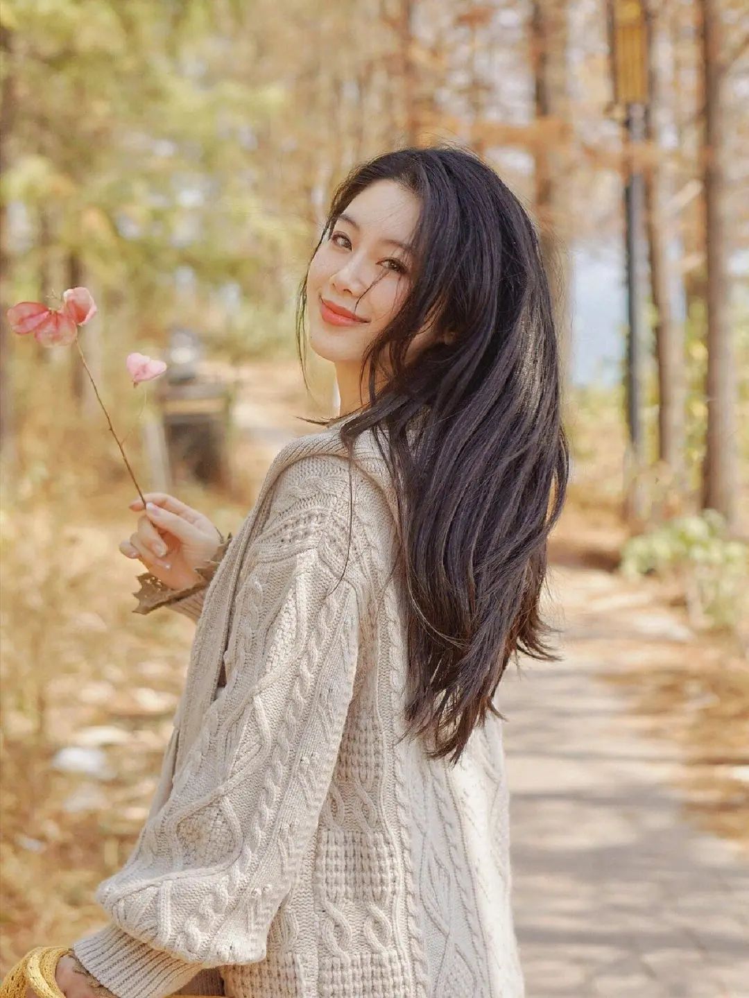 想要拍出自然的照片?试试背对镜头,假装有人在后面喊你,然后转身微笑看镜头。这种回眸的动作给人一种不经意的美感,手里拿着一枝花,更能增添照片的层次感和柔美气质。