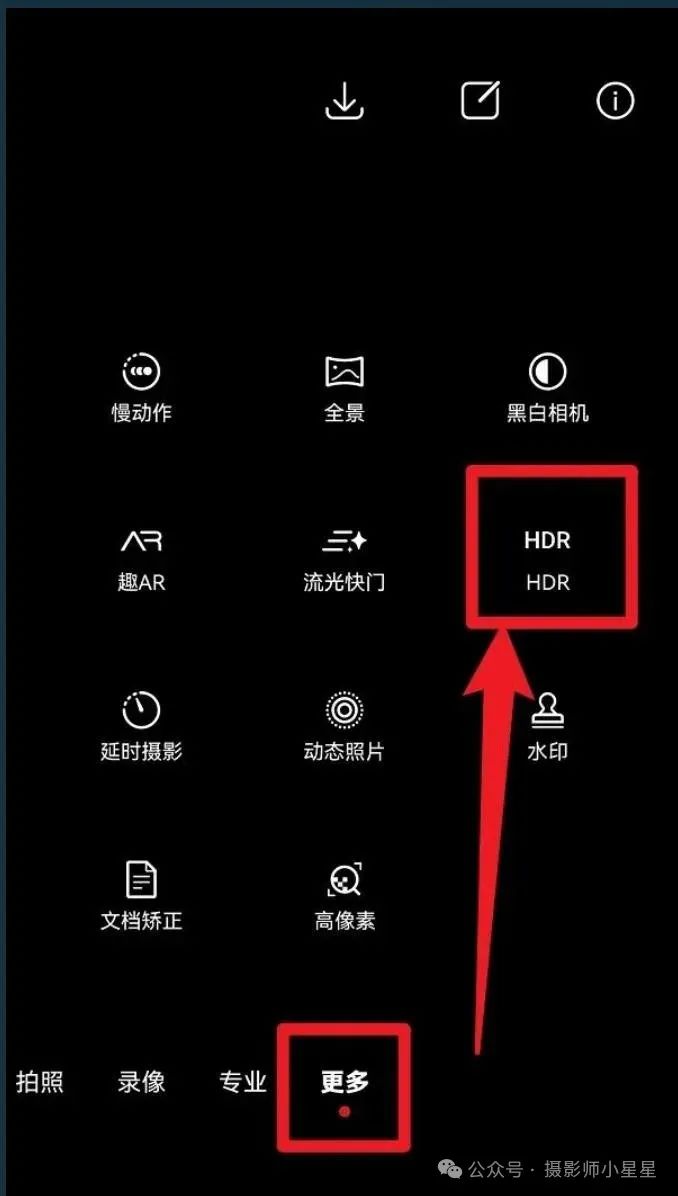 此时我们启用手机自带的HDR模式,就能够改善这一情况。打开手机里的【更多】,就能找到【HDR】模式。