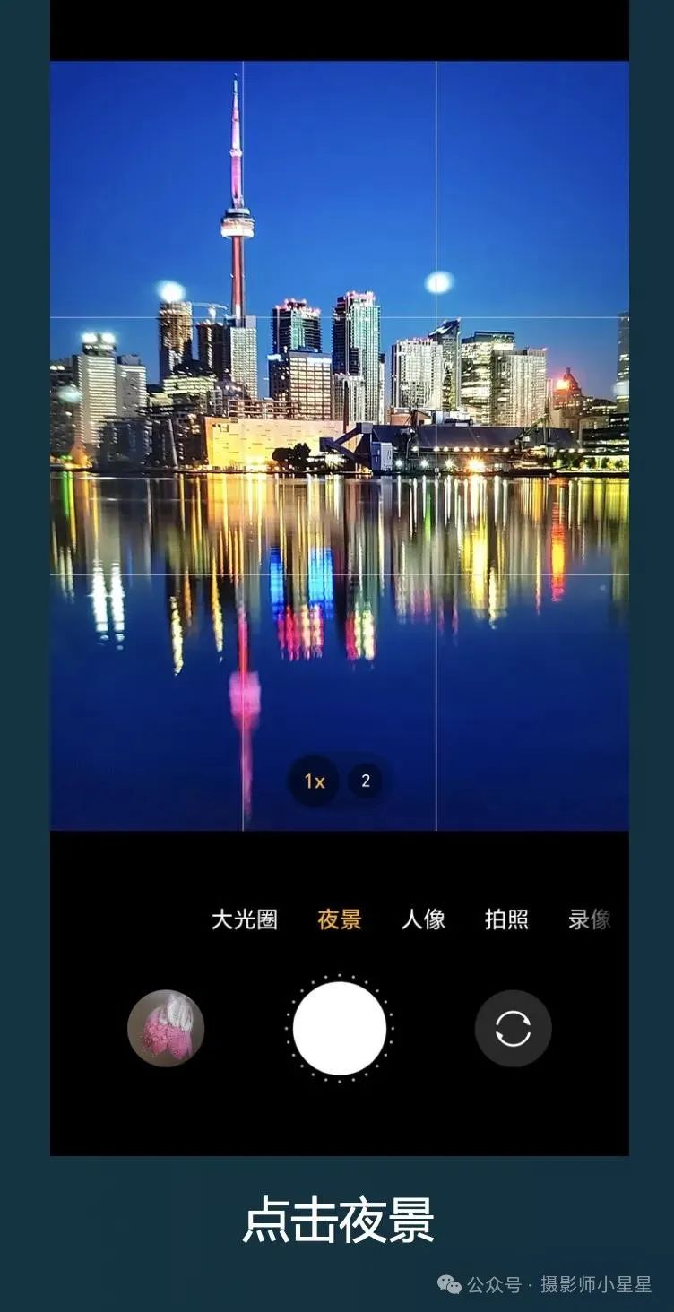 大多数手机相机的菜单栏里自带【夜景】模式,打开就可以进行拍摄了。